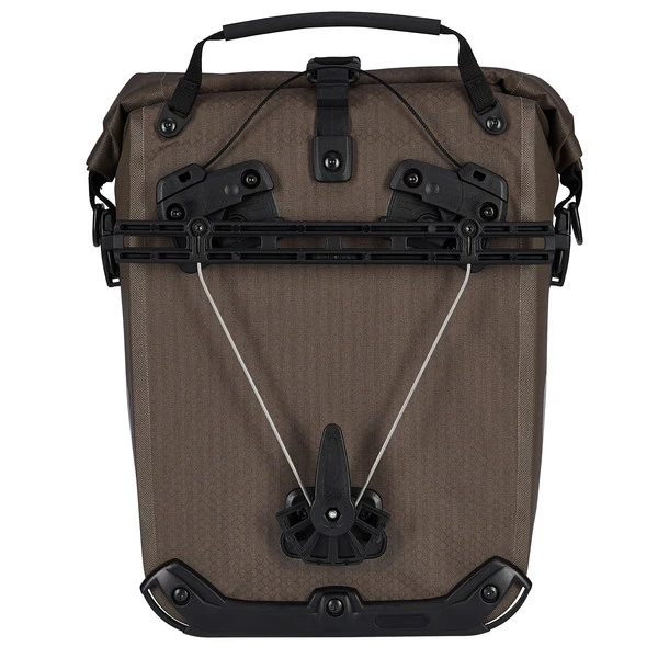 Komfortabel und schnell, sowohl beim Einhängen als auch beim Aushängen. Und die Rückseite der Fahrradtasche ist glatt, ganz ohne hervorstehende Teile. Das Gravel-Pack QL3.1 wird nur am unteren Aufnahmepunkt aufgesetzt und anschließend oben von links oder von rechts in die Halterung eingeschwenkt und arretiert. Schon sitzt das Gravel-Pack QL3.1 sicher am Gepäckträger. Abnehmen ist ebenso kinderleicht: Am Griff ziehen, schwenken, fertig!