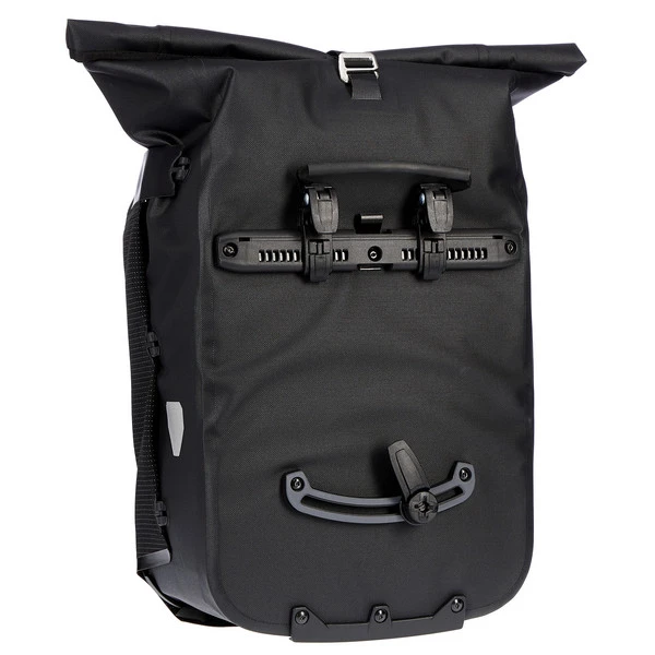 Aufhängung für Gepäckträger mit einem Rohrdurchmesser von 8 bis 16 mm. Die beiden oberen Haken lassen sich werkzeugfrei auf der aus einem Stück gefertigten Schiene verschieben und durch Anheben des Tragegriffs öffnen. Der untere Arretierungshaken ist ebenfalls auf einer halbelliptischen Schiene individuell anpassbar und werkzeugfrei in 15-Grad-Schritten drehbar. Ein Scheuerschutz im unteren Bereich der Taschen und an der Auflagefläche des Gepäckträgers beugt Abrieb vor.