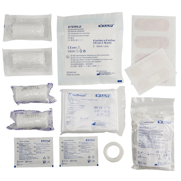 Erste-Hilfe-Set mit Basisausstattung für kleinere Verletzungen. Praktisch: alle Teile sind in einem wasserdichten Packbeutel mit Rollverschluss verstaut.
